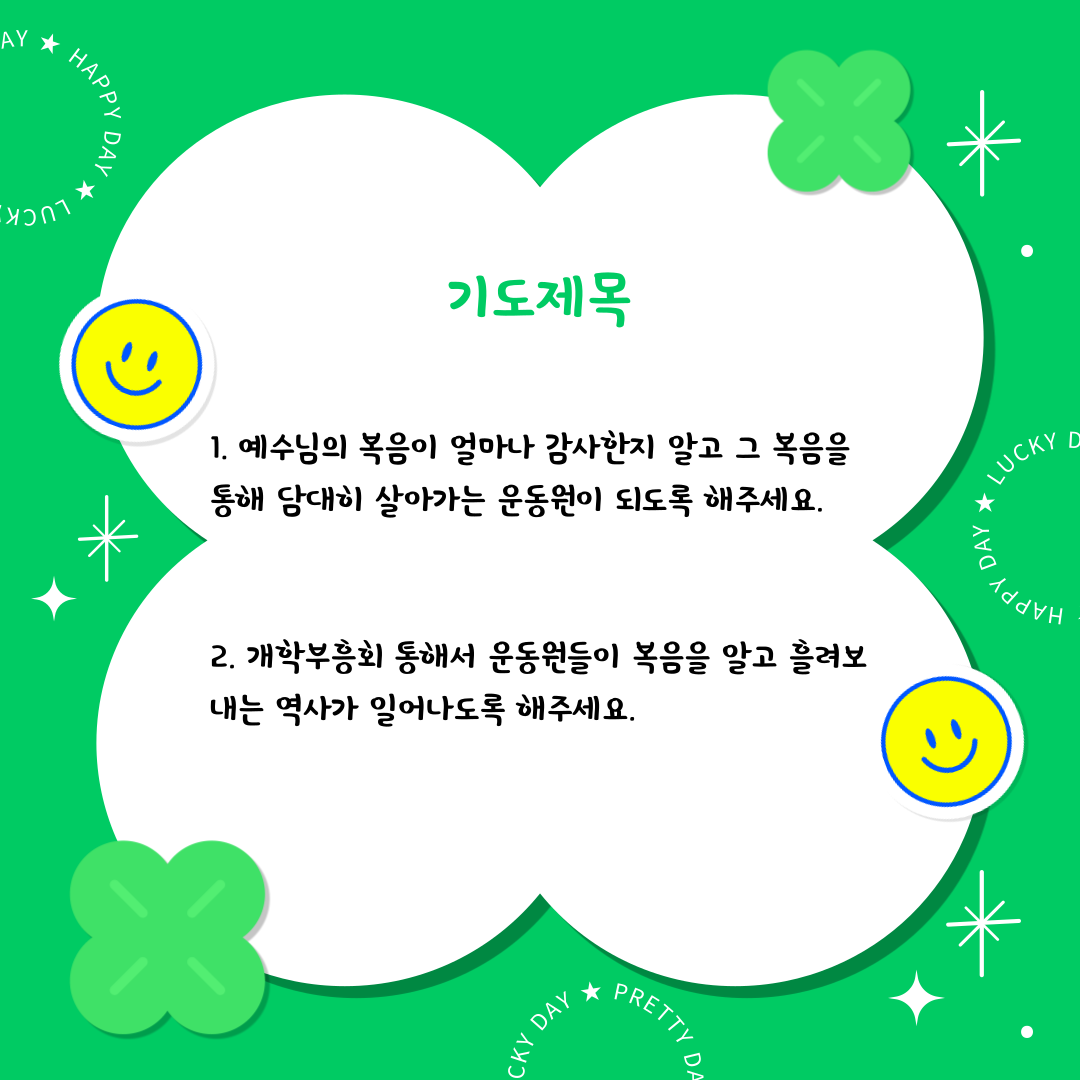 지난 9월 7일에 '복음 품고 뛰어'라는 주제로 개학부흥회를 진행했습니다. 브라가 찬양팀의 아름다운 찬양으로 주님께 영광을 돌리고 문효성 간사님의 복음에 대한 말씀을 들으면서 1부 예배가 진행되었습니다. 2부 순서는 1부 순서 때 말씀을 들은 것을 토대로 교화와 학교 등 다양한 삶의 현장에서 겪을 수 있는 상황들에 대해 상황극을 진행하였습니다. 복음을 품은 그리스도인답게 어떻게 지혜롭게 대처를 하고 말을 할지 고민하고 상황을 직접 연기함으로써 그리스도의 향기를 뽐내는 하나님의 자녀로 조금 더 성장했을 거라 믿습니다 :) 상반기 개학부흥회보단 인원이 덜 왔지만 그럼에도 불구하고 휴일에 시간을 내서 개학부흥회에 나아온 운동원들이 있기에 힘이 나고 더욱 열심히 섬길 수 있었습니다. 하나님이 하나님 되시도록 겸손으로 복음을 전하는 저와 운동원들이 되길 소망합니다!