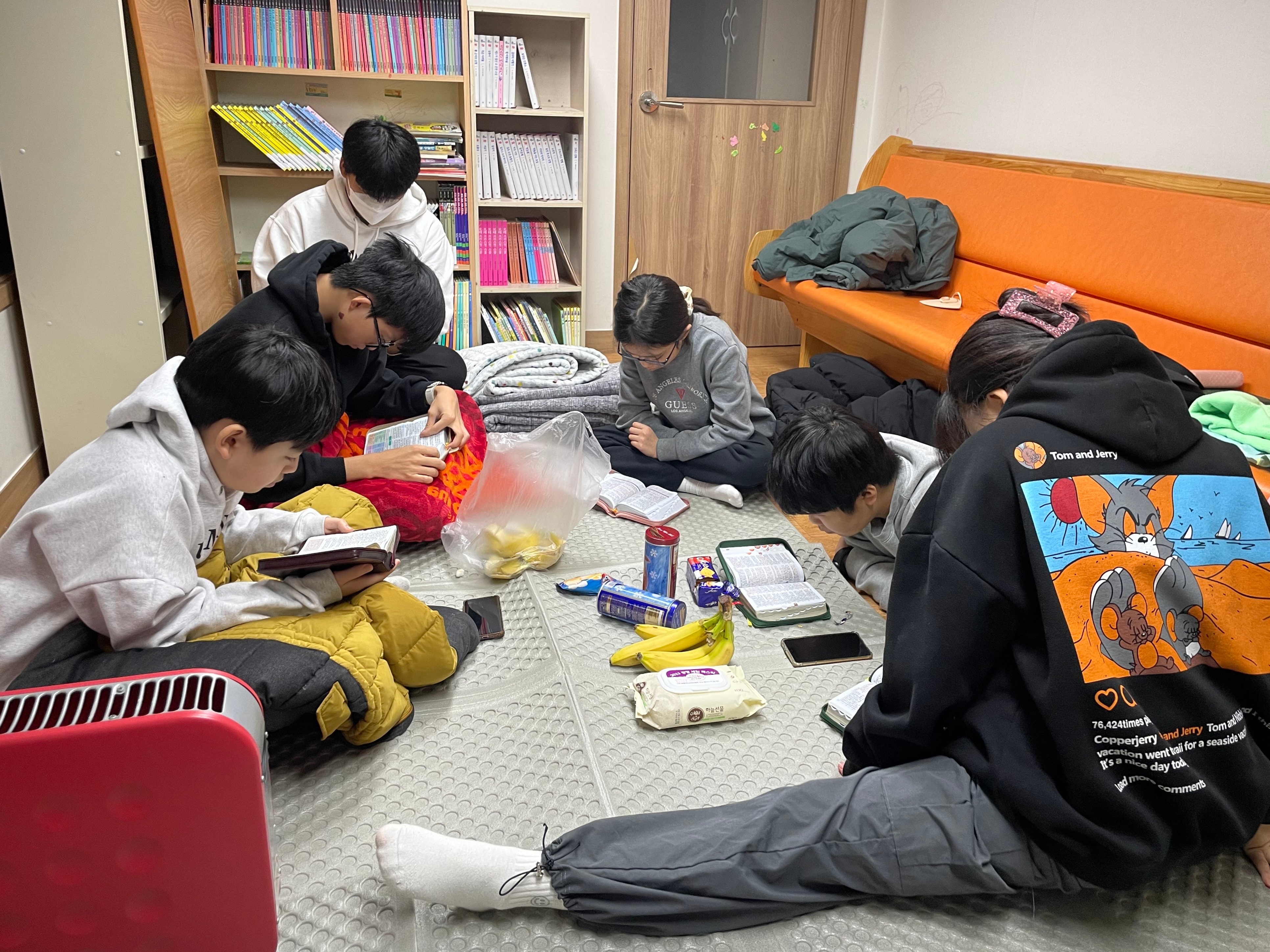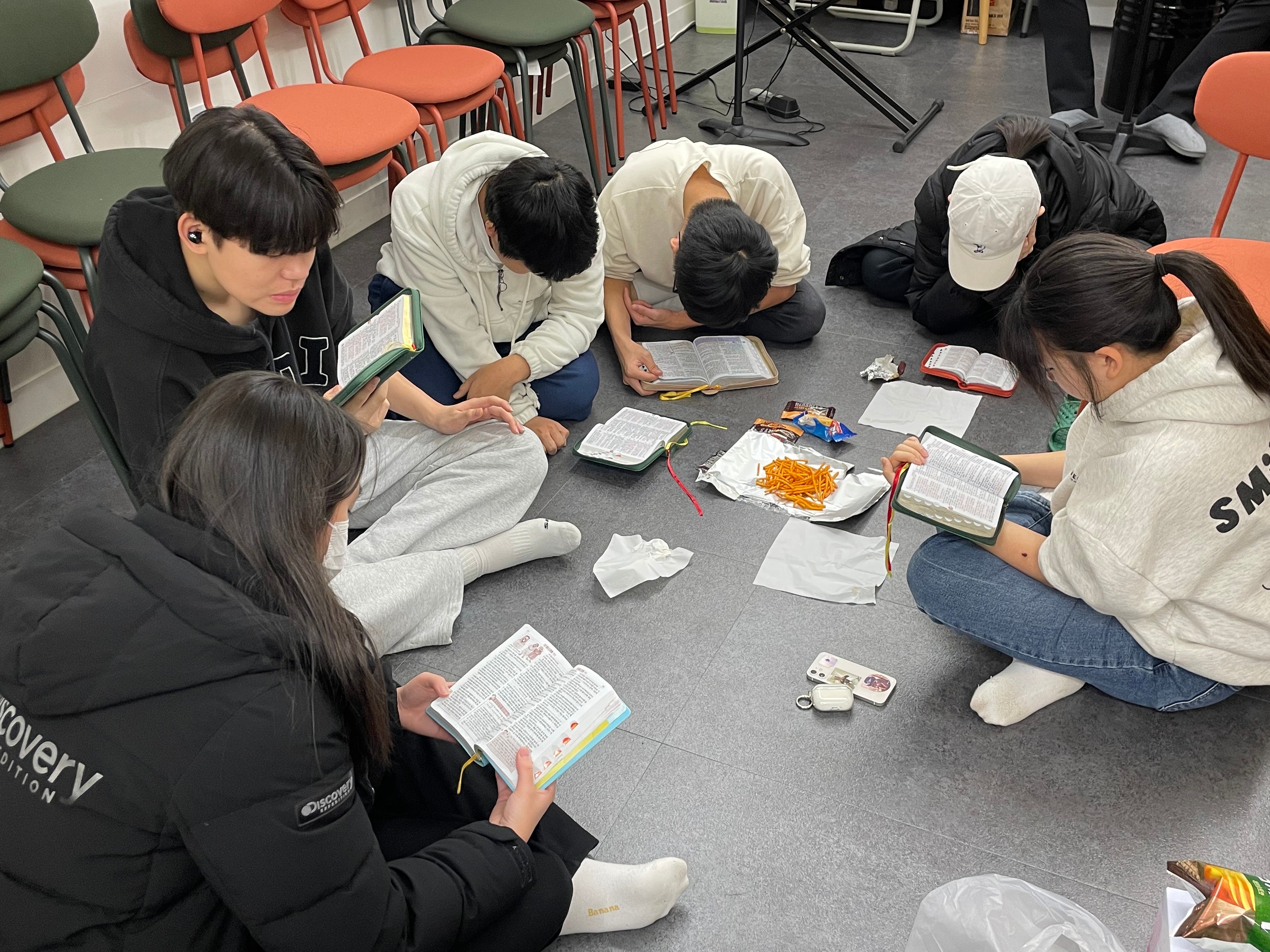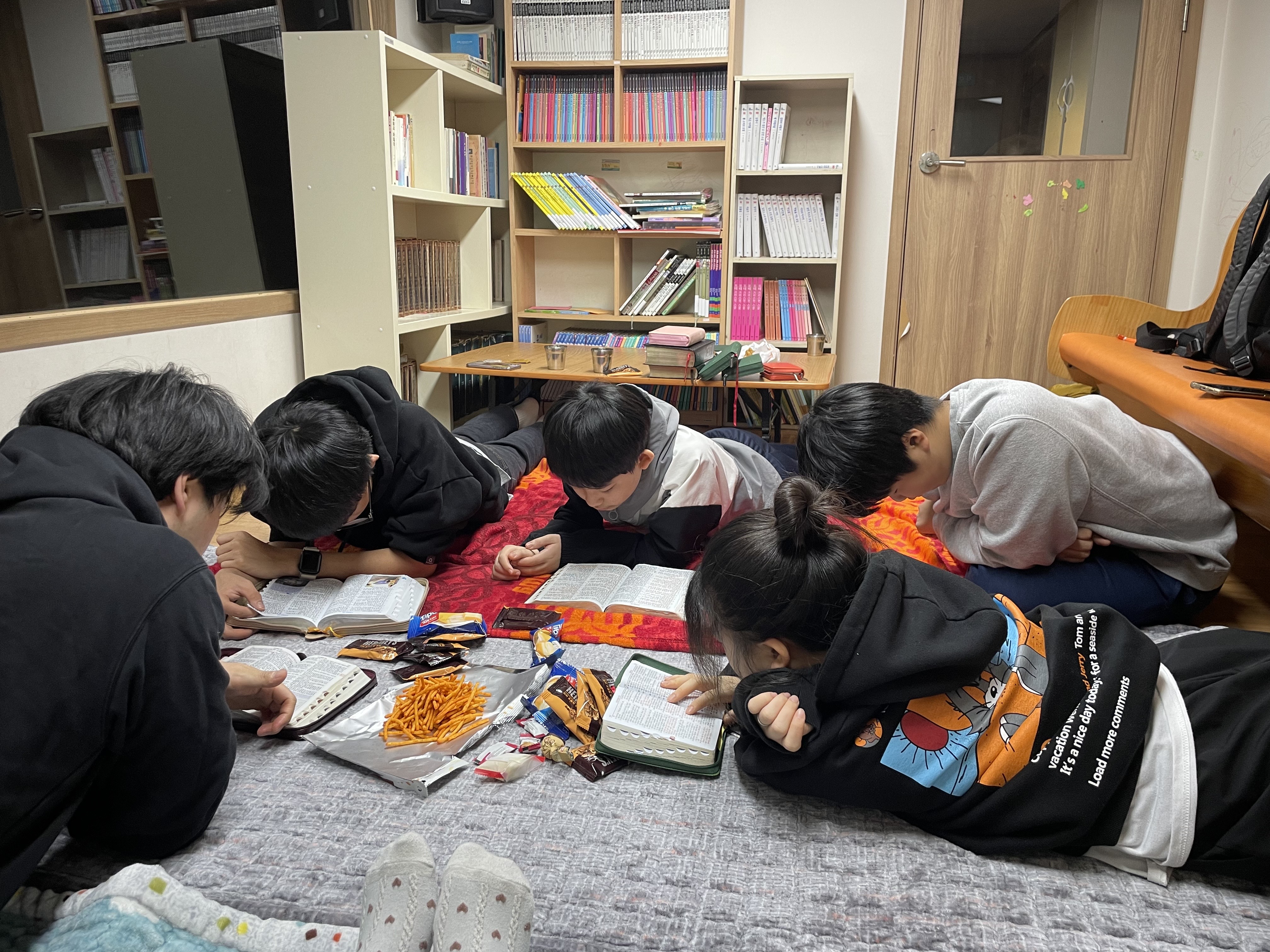 작년까지는 예배가 마치고 12시 10분에 고등학생 반과 1시에 중학생 반으로 나누어져서 성경 읽기가 진행되었어요. 그런데 올해부터는 두 개의 소그룹 반으로 나누어졌기 때문에, <설교 나눔>과 <공동체 성경 읽기>를 같이 진행하게 되었어요. 담당 목사님께서는 저희가 평소에 성경 한 장도 잃지 않을 거라는 것을 너무 잘 아셔서 주일만큼은 서로 모여서 공동체로 성경을 읽자고 제안하셨어요. 벌써 횟수로 3년간 진행되고 있는데 처음에는 어색하고 귀찮았어요. 그런데 점점 말씀이 우리를 죄에서 자유 하게 하고, 올바른 길로 인도하며 힘든 상황 중에 견디게 해준다는 사실을 경험하게 해주었어요. 그래서 이제는 이 시간을 가장 소중하게 여기고 즐거워하고 있어요. 그리고 매년 12월 말에 결산식이 있는데, 성경 다독 상도 주시기 때문에, 저희가 공동체 성경 읽기에 열심히 참여할 동기를 부여받고 있어요.