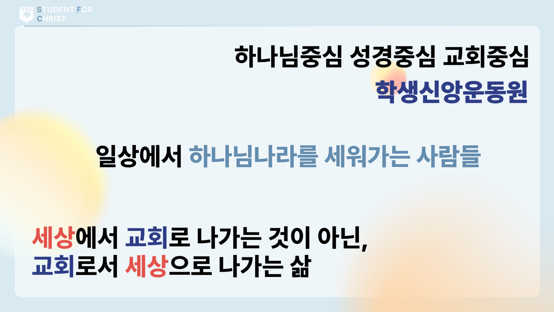 이 세 가지의 중심성을 외치는 사람은 모두 학생신앙운동원입니다. 우리는 이제 더 이상 세상에서 교회로 나오는 사람이 돼서는 안됩니다. 이제 우리는 교회로서 세상으로 향해야 합니다. 우리가 머무는 캠퍼스에서, 직장에서 관계성에서 우리는 하나님 나라를 드러내고 세우는 것이 힘써야 합니다.