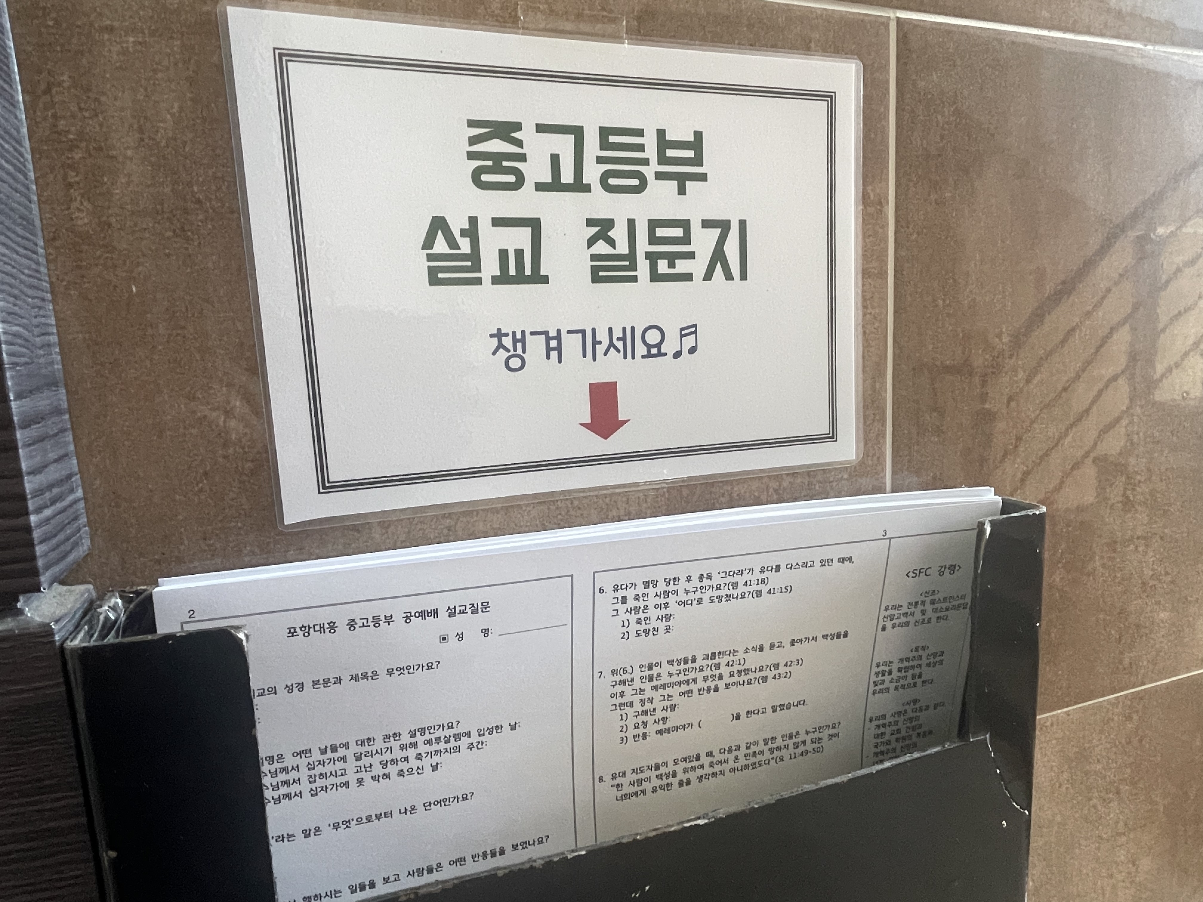 저희 포항대흥교회 SFC의 첫 번째 특징은 모든 중고등부 학생들이 ‘주일 공예배’를 드린다는 것입니다. 저희 교회 공예배는 1부(오전 9시 반)와 2부(낮 12시)로 나눠서 드리고 있는데요. 중고등부 친구들은 모두 오전 1부 예배를 드린 이후에 ‘중고등부 자체 모임’을 가지고 있습니다. 중고등부에서는 친구들이 공예배에 잘 적응할 수 있도록 돕기 위해, 매년 첫 5~6주간 ‘공예배 예전’이 지닌 의미에 대한 교육을 시행하고, 더불어 매주 중고등부 주보에 ‘공예배 설교 이해를 돕기 위한 질문지’를 제공하고 있습니다. 그렇게 중고등부 친구들이 ‘관람객’이 아닌 ‘예배자’로 설 수 있도록 도우려 노력하고 있습니다. 이에 따라 SFC 모임 시간은 ‘예배’ 대신 ‘모임’이라는 용어를 쓰고 있고, 시행되는 메시지 역시 ‘설교’가 아니라 ‘교육’이라고 부르고 있습니다.