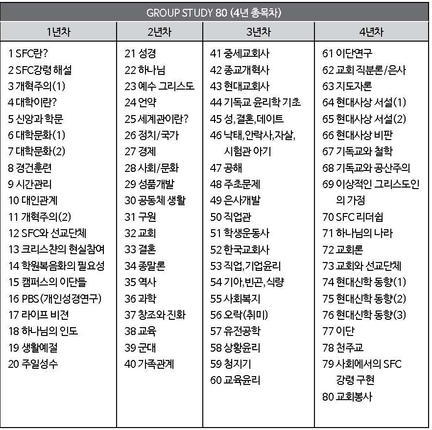 ※ 이 글은 2014년에 발행된 『알돌메뉴얼』 에서 발췌한 글입니다. 1. 대학SFC의 정체성과 양육 학원 복음화 운동을 위한 양육 SFC 비전선언문에서 SFC의 운동을 ① 전도와 선교운동, ②성경적 리더십 양성운동, ③ 성경적 대안실천운동 3가지로 정리하고 있다. 이 세 가지는 분리된 운동이 아니라 한 운동의 3가지 운동원리라고 보아야 한다. 성경적 리더십 양성운동이 결코 전도와 선교운동, 성경적 대안실천운동과 분리된 것이 아니다. 양육은 운동을 위한 것이고, 운동은 양육을 포함하고 있다. 『3-7 교과과정 운영안』(1994, SFC본부) 9쪽에 보면 이런 SFC의 정체성과 양육의 원리에 대해서 잘 정리해 놓고 있다. SFC는 범죄 타락한 인간에게 예수 그리스도의 새 생명을 얻게 하고, 그가 선 자리에..