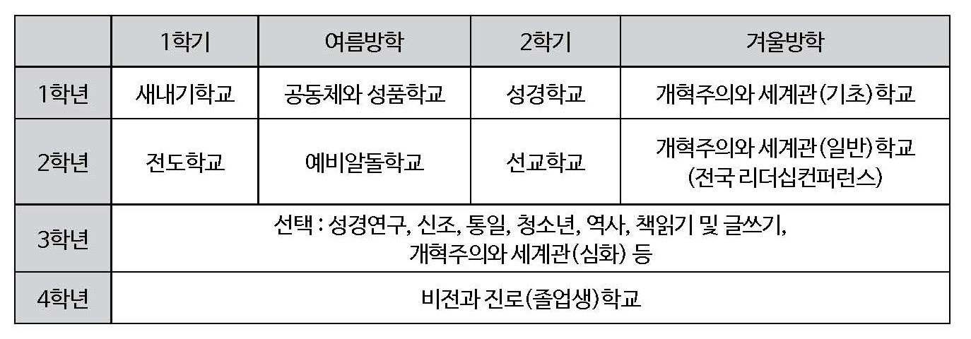 학생신앙운동원 양육을 위한 교과과정은 크게 “교육의 현장” 그리고 “삶의 현장”으로 나누어 진다. 오늘에 행해지는 세상교육이 지식습득을 그 목표로 하고 있고 교육의 현장에만 모든 관심이 집중되어 있는 까닭에 많은 부차적인 문제들을 야기시킨다고 본다. 세상의 교육이 지적추구를 목표로 한다면 교회교육은 삶의 변화를 궁극적인 목표로 함은 명백하다. 피교육자의 삶의 현장(적용의 현장)을 고려하지 않는 교육의 현장은 이미 그 방향을 상실한 것에 다름 아니다. 그 교육은 이미 죽은 것이다. 이러한 까닭에 우리는 교과과정에 있어서 교육의 현장에만 고민할 것이 아니라 적용이 현장을 함께 생각하고 이 논의를 진행시켜가야 할 것이다.