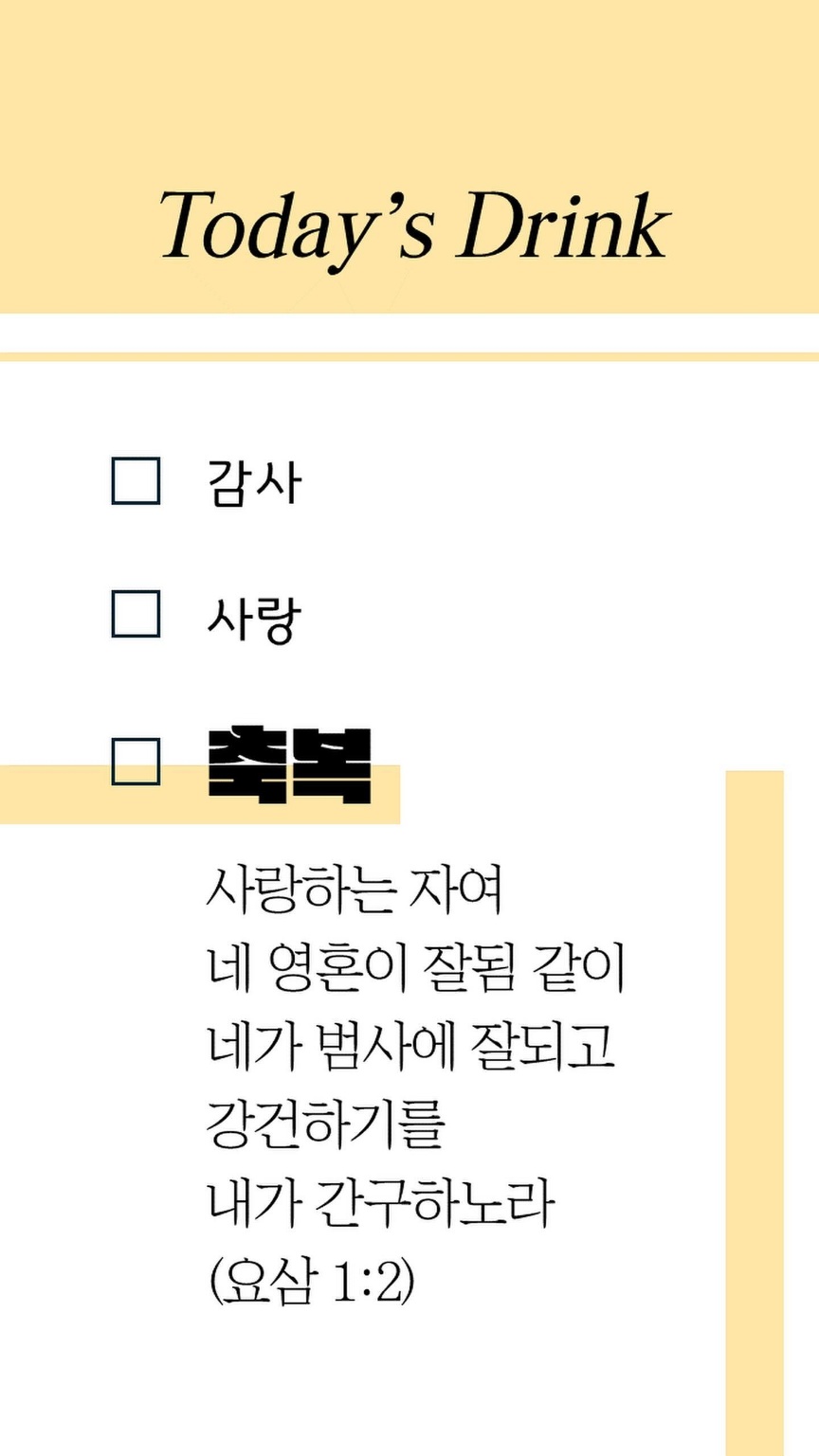먼저 SFC 로고와 사랑, 감사, 축복 키워드를 강조한 인스타그램 패널을 만들었습니다. 이 판넬을 들고 폴라로이드 사진을 찍고 인화되기를 기다리면서 사랑, 감사, 축복 키워드 중 하나를 무작위로 뽑아서 이 키워드를 포함한 메시지를 지인에게 보내도록 했습니다. 전송한 메시지를 인증하면 해당 키워드가 관련된 성경구절 스티커가 붙은 따뜻한 음료를 선물로 드렸습니다.