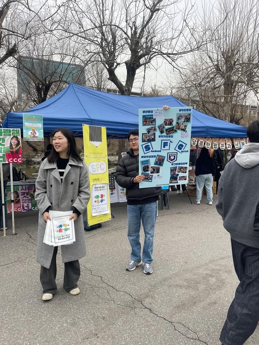 개강 첫 주, 기독교동아리연합회 주최 가두모집에서는 간식을 미리 포장하고 SFC 소개 패널을 제작하여 선교단체에 관심을 갖는 학우들에게 나눠주고, 판넬을 통해 SFC를 소개하였습니다.