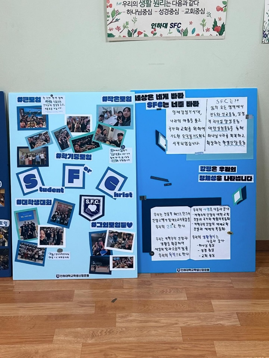 인하대 SFC는 1984년부터 인하대 동아리연합회 종교분과에 소속된 중앙동아리로 학생회관(비룡플라자) 454호에 동아리방이 있습니다. 큰 모임은 매주 수요일 오후 6시 동아리방에서 진행되며, 작은 모임은 소그룸 모임으로 모임별 시간을 맞추어 긴밀한 교제와 책 모임으로 진행됩니다.