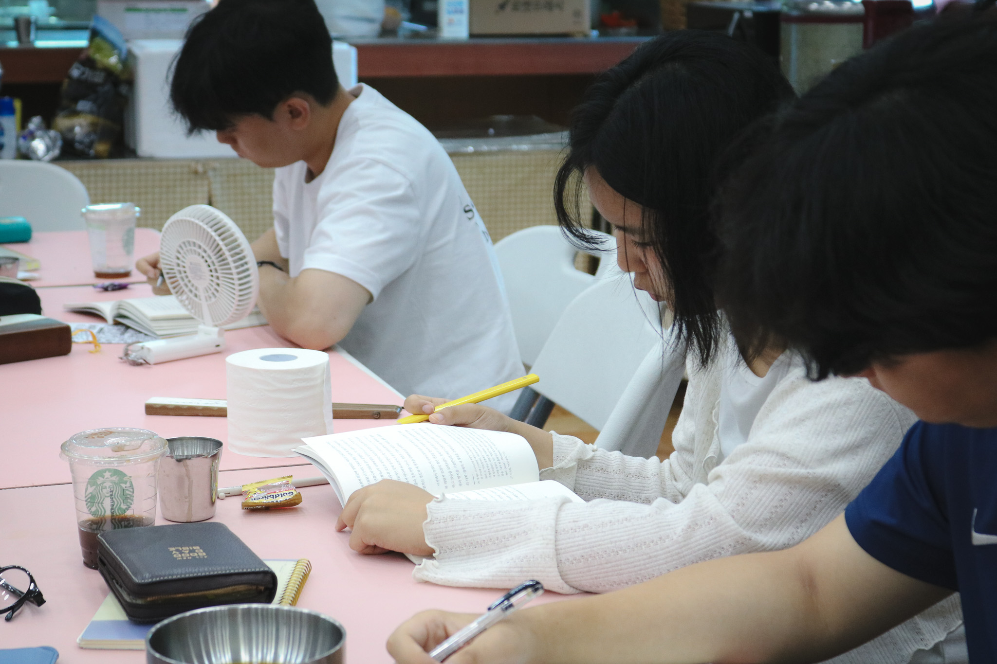 무엇보다도 좋았던 건 성경말씀 읽기와 책읽고 나눔이다. 평소에 성경을 읽어야 한다고 머릿속으로 생각하고 실천하기 어려웠는데 이번 계기를 통해 한걸음 나아간 것 같아서 뜻깊었다. 그리고 늘 폰을 잡고 했던 그 시간에 손에 책을 들고 다같이 한 책을 가지고 읽고 질문에 나눔을 할 수 있어서 동기부여가 되고 좋은 레슨을 얻을 수 있었다.