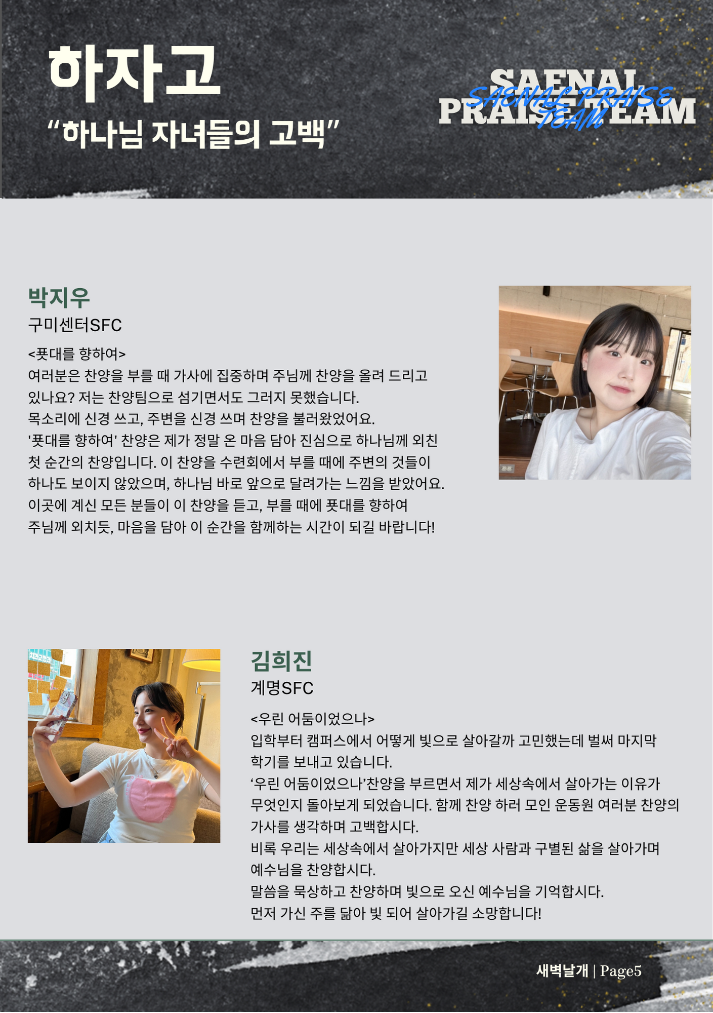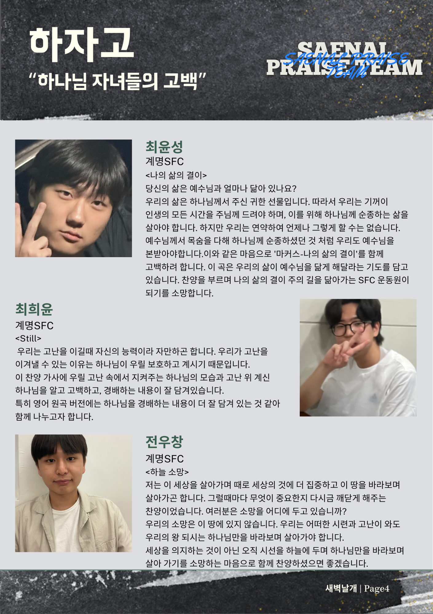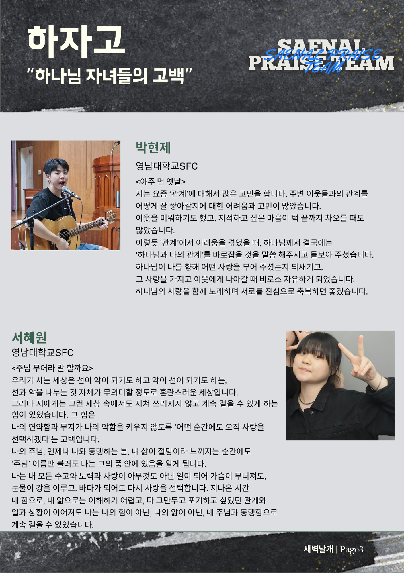 SFC는 각 지역마다 찬양팀을 운영하고 있습니다. SFC 큰모임에 함께 찬양하기 위해 찬양을 인도하는 고정적인 팀이 필요하기 때문입니다. "새벽날개"는 대구경북권 SFC 모임을 섬기는 찬양팀입니다. "새벽날개"는 2024년 10월 5일 오후 4시에 대구에 있는 새생명교회당에서 "콘서트" 를 열었습니다. 단독 콘서트를 연 "새벽날개" 찬양팀의 이야기를 들어보았습니다.