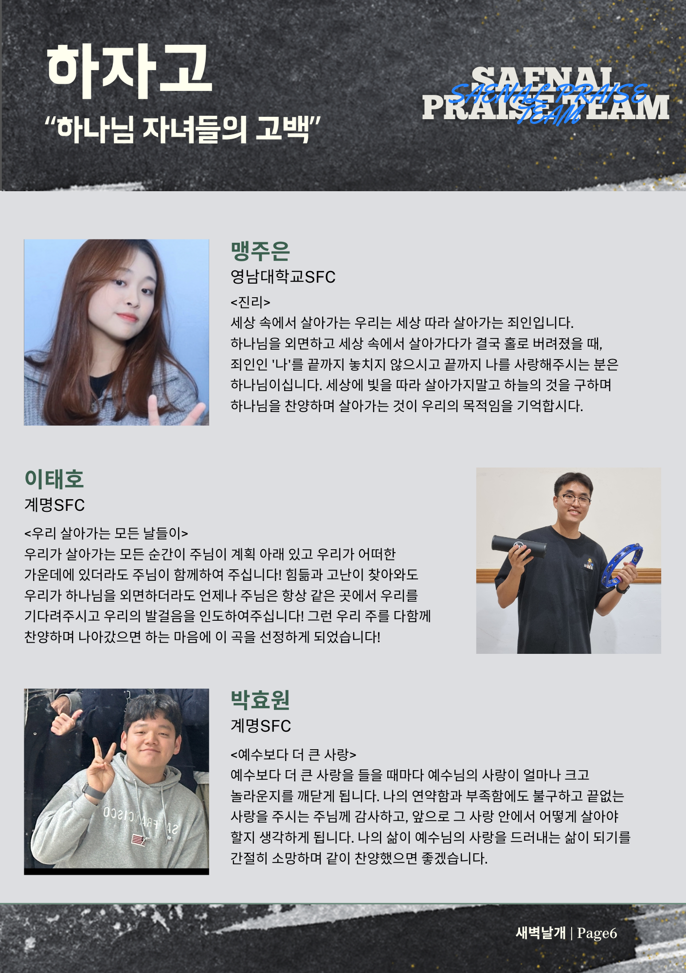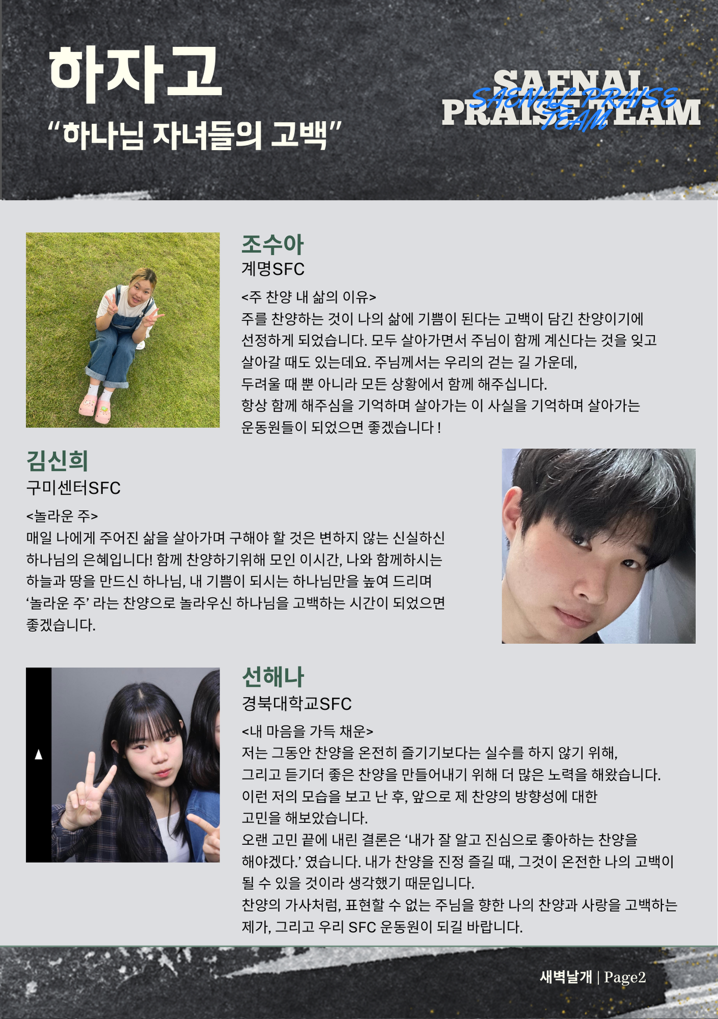 우리의 목적을 다합시다. 삶에서 하나님을 진정으로 즐거워하며 살아가는 것이 참 어려운 세상입니다. 하지만 그럴수록 그러한 세상에 관심을 가지고 우리의 목소리를 냅시다. 여러분이 찬양할 때 소리치던 모습을 기억합니다. 그 모습과 마음 그대로 하나님을 바르게 알고 즐거워하며 살아갑시다. 그렇게 하나님 영광을 노래하는 삶 살길 소망합니다. 예수님을 위한 학생들이, 이 시대를 예수로 살길 소망합니다. 주 안에서 사랑합니다♥