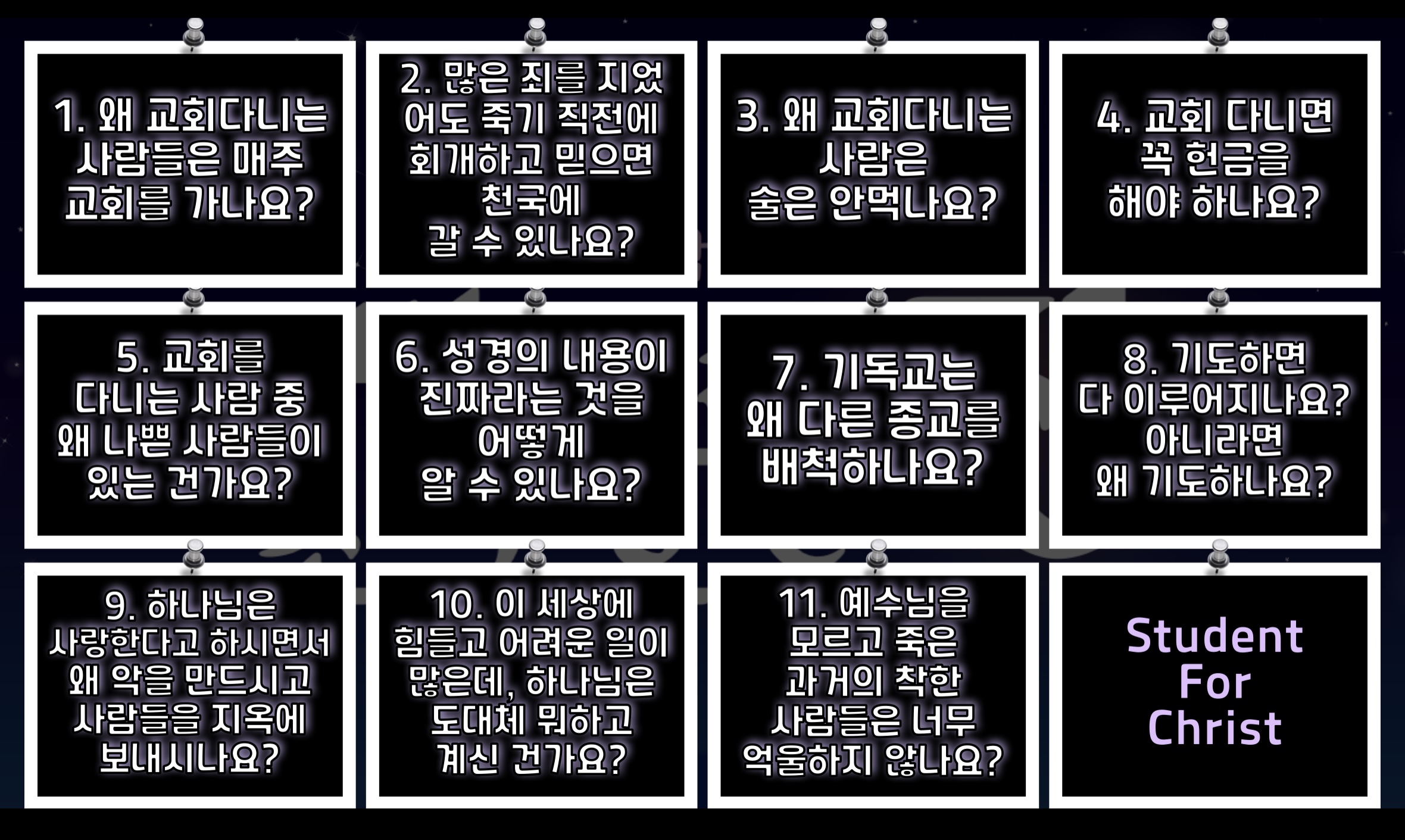A. 세상 사람들이 궁금해 할만한 기독교 관련 질문을 준비했습니다. 교회를 다니지 않는 사람들, 하나님을 잘 모르는 사람들도 살아가다보면 교회나 하나님에 관해 궁금한 것들이 생기기 마련이라고 생각합니다. 그런 사람들의 궁금증을 풀어주며 자연스럽게 하나님에 대해 전할 수 있을 것이라 생각했습니다. 왜 매주 교회에 가야하는지, 헌금은 왜 내야하는지, 왜 그리스도인들은 술을 마시지 않는지 등 여러 질문들을 준비했고 답변을 통해 하나님의 사랑과 하나님은 어떠한 분이신지 들을 수 있었습니다.