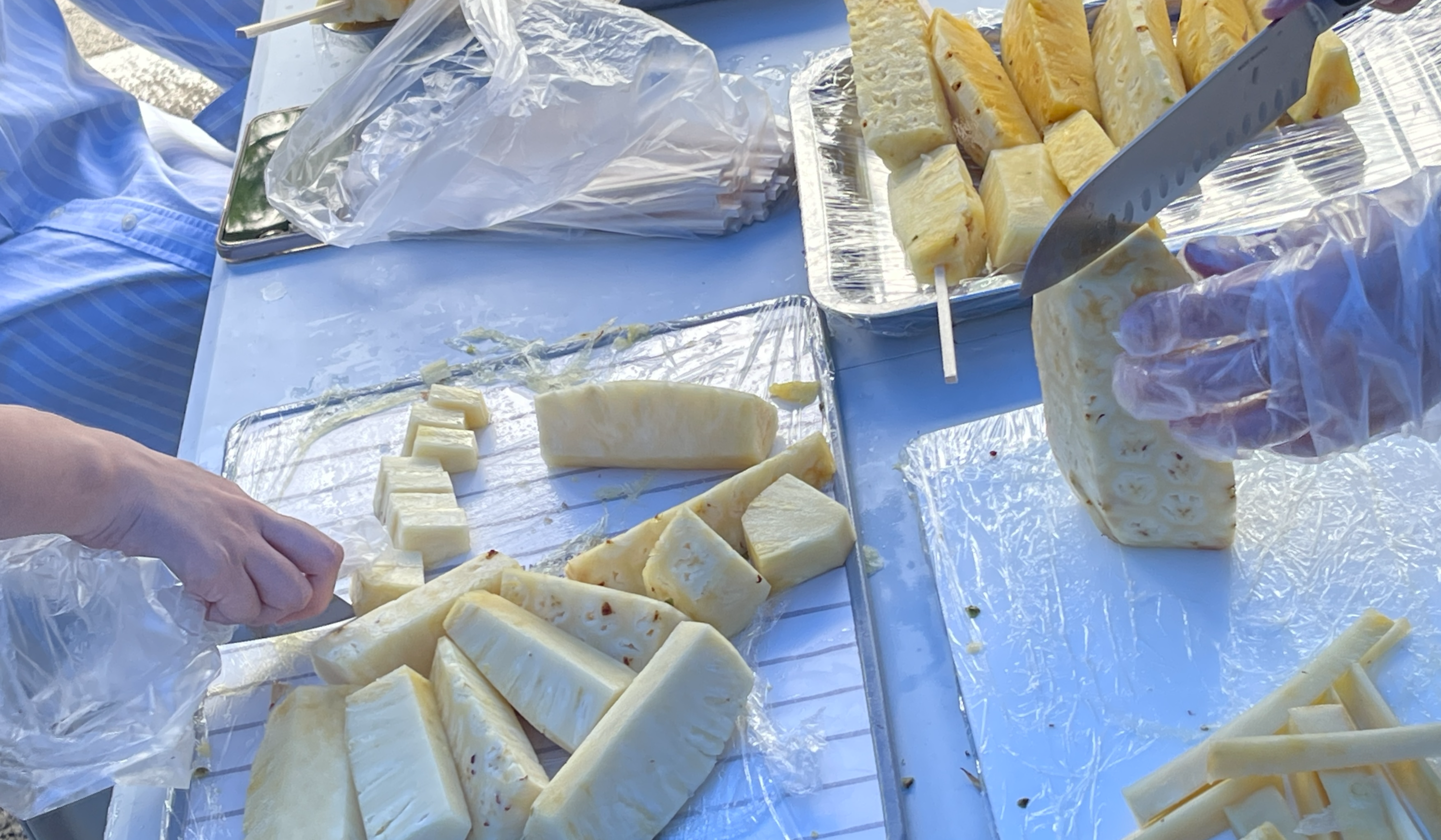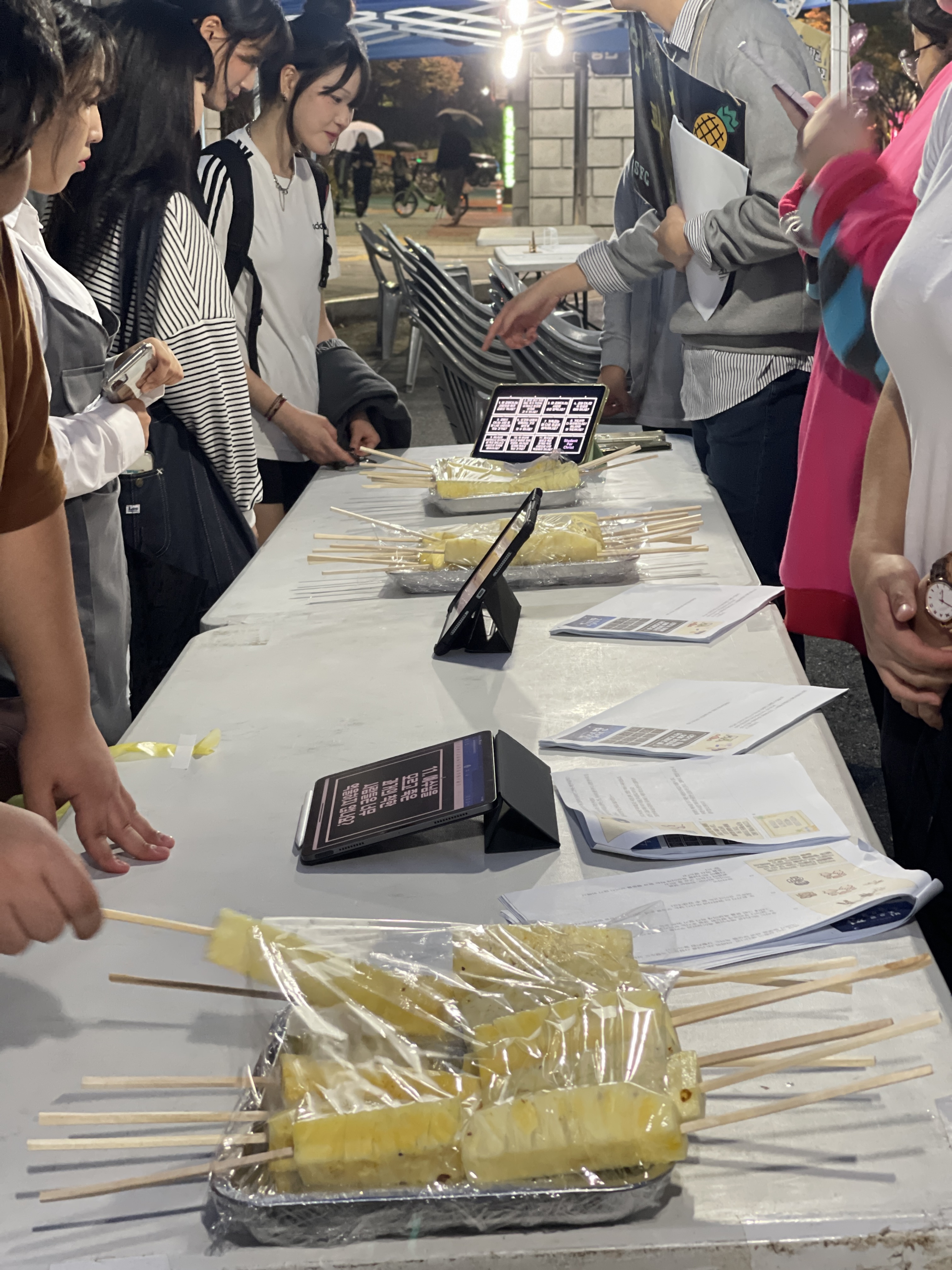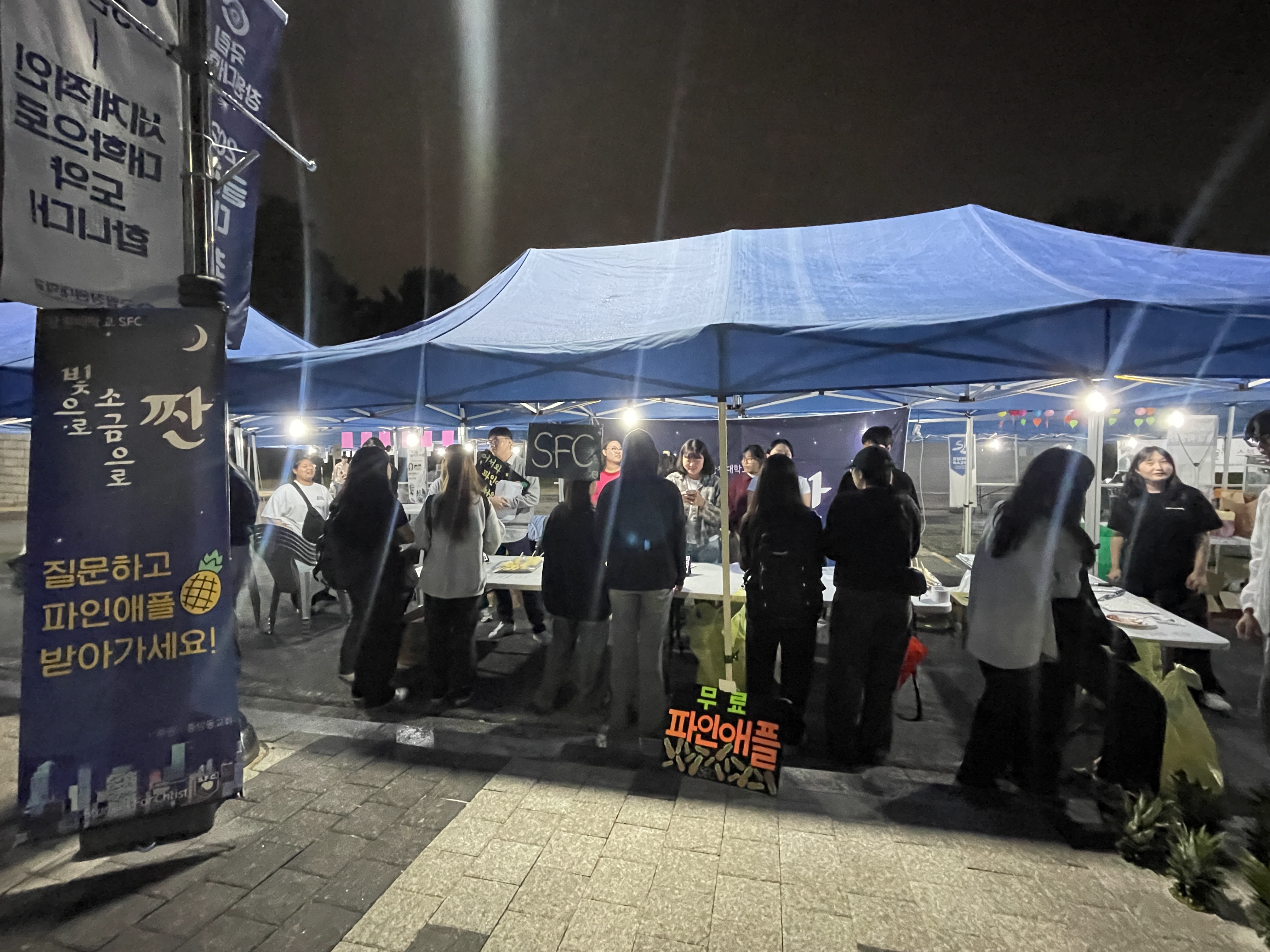 A. 창원대 SFC는 창원대 총동아리연합회 소속 중앙동아리로 축제 중 부스로 참여하였습니다. 부스에서는 SFC의 꽃, 시그니처라고 할 수 있는 파인애플 바를 나눠주었습니다. 파인애플을 잘라 나무 젓가락에 꽂아주는 것이 흔한 것은 아니라 많은 학생들이 관심을 가지고 찾아왔습니다. 도매시장에서 직접 사서 더 달고 맛있는 파인애플이라 소문을 듣고 더 많이 찾아와주었습니다.