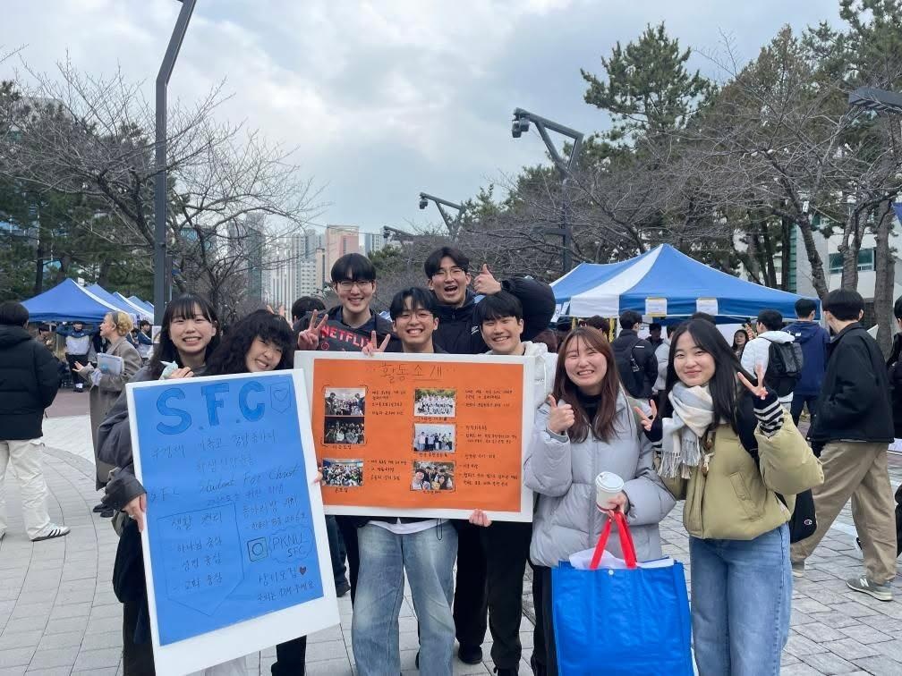 부경대 SFC는 부경대를 다니는 SFC 운동원으로 구성된 SFC 입니다. 부경대 동아리연합회에 가입된 중앙동아리입니다 동아리방은 한솔관 B동 2층 206호 입니다. 모임으로는 매주 목요일 저녁에 큰모임으로 모이고 있고 다양한 작은 모임들도 있습니다. 부경대 SFC는 동아리 소개 한마당을 통해 판넬을 제작해서 신입생들과 재학생들에게 SFC를 알리고 전도했습니다.부스에 방문한 모든 학생들에게 준비한 팝콘을 나눠드리고 판넬을 이용해서 어떤 모임을 가지는지 어떤 운동을 하고 있는지 설명해드렸습니다 추가로 꼬깔 모자를 활용한 게임을 진행한 후에 제시어를 맞추신 분들에게 SFC L자파일, 볼펜, 스티커, 팜플렛 등 굿즈를 드리는 이벤트를 진행했습니다.
