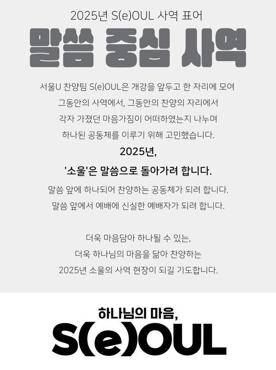 2025년의 사역을 바라보며, 소울은 2025년을 ‘말씀 중심 사역’이라는 표어를 가지고 찬양의 자리에 서보려 합니다.